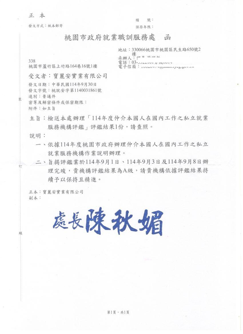 20251003賀月嫂幫獲就業服務機構評鑑A級肯定!